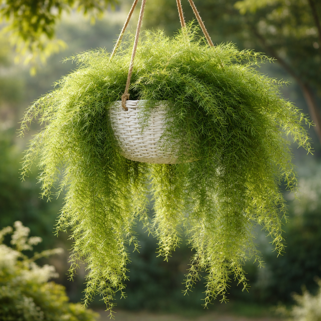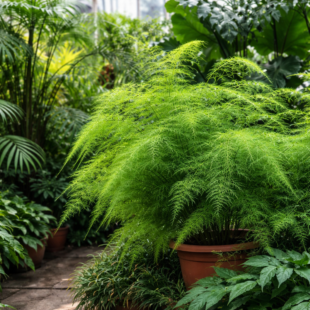 Asparagus setaceus (Asparagus Fern, Climbing Asparagus, Grass Fern, Lace Fern) is a graceful, evergreen ornamental grown for its fine, feathery foliage. Growth habit: Climbing or scrambling perennial with wiry, arching stems Foliage: What look like leaves are actually soft, needle-like cladodes arranged in flat, lace-like sprays; true leaves are tiny scales Color: Bright to deep green, giving a light, airy texture Flowers: Small, white to greenish-white, mildly fragrant, usually inconspicuous Fruit: Small round berries that turn purple-black when ripe (ornamental, not edible)