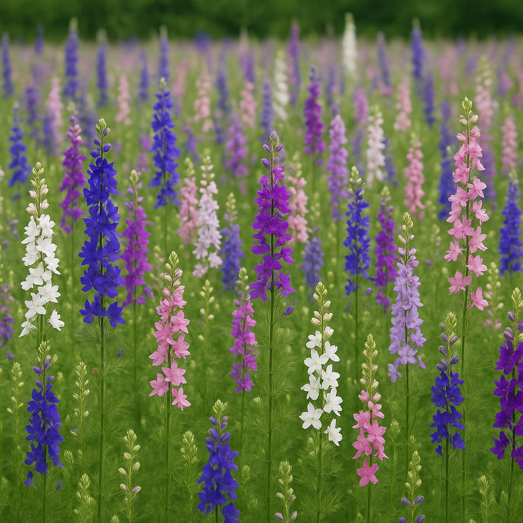 Rocket Larkspur plants can reach heights ranging from 1 to 3 feet (30 to 90 centimeters) and feature slender, erect stems. The flower spikes are the main attraction of this variety, rising above the foliage in a vertical manner. The 'Imperial Mix' consists of a diverse range of colors, including shades of blue, purple, pink, and white. The mix provides a vibrant and visually captivating display in gardens and landscapes.