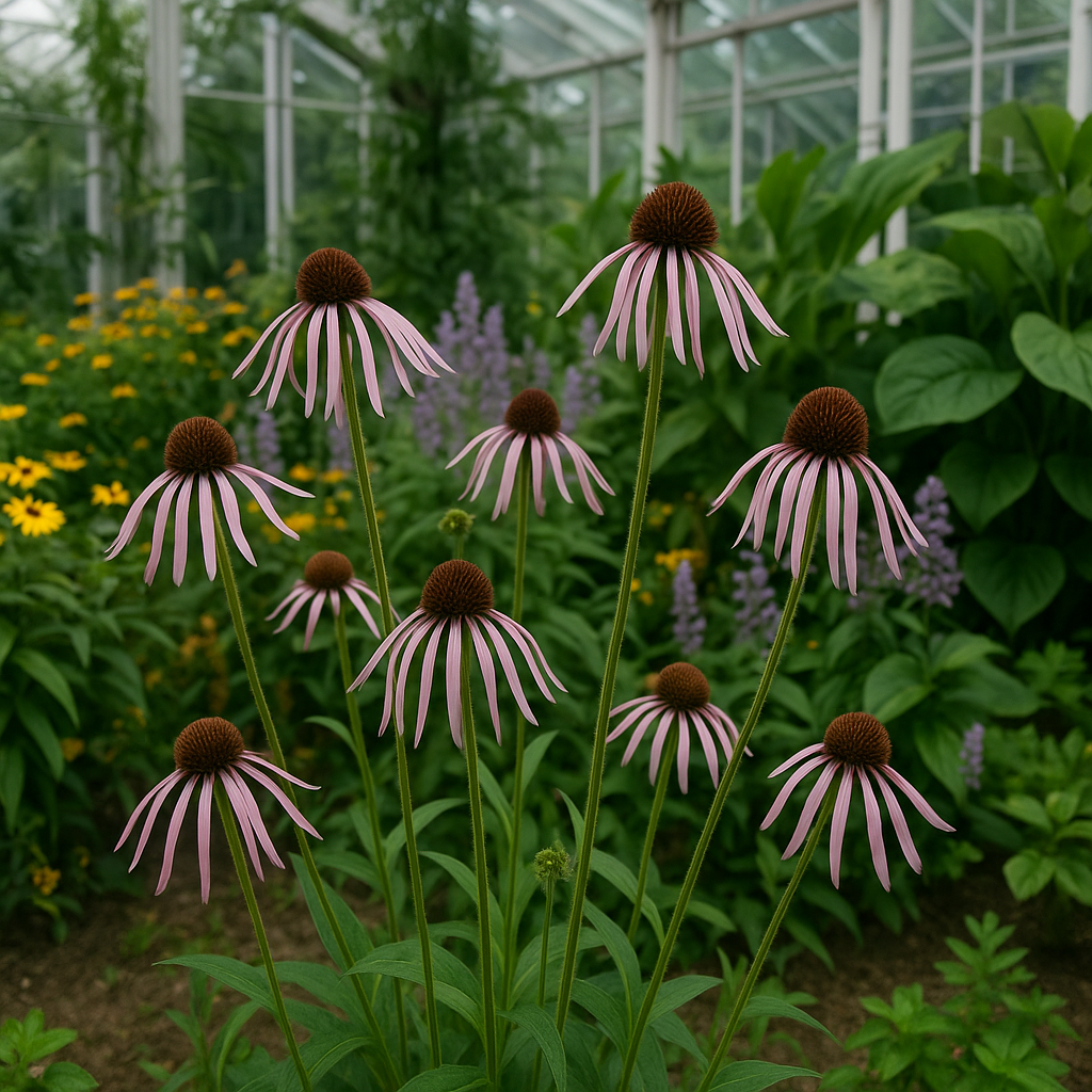 Appearance: Pale Purple Coneflower typically grows to a height of 2 to 4 feet (60 to 120 centimeters). It has slender, upright stems and narrow, lance-shaped leaves with a pale green color. The flowers have pale pink to lavender-purple petals that surround a prominent cone-shaped center.