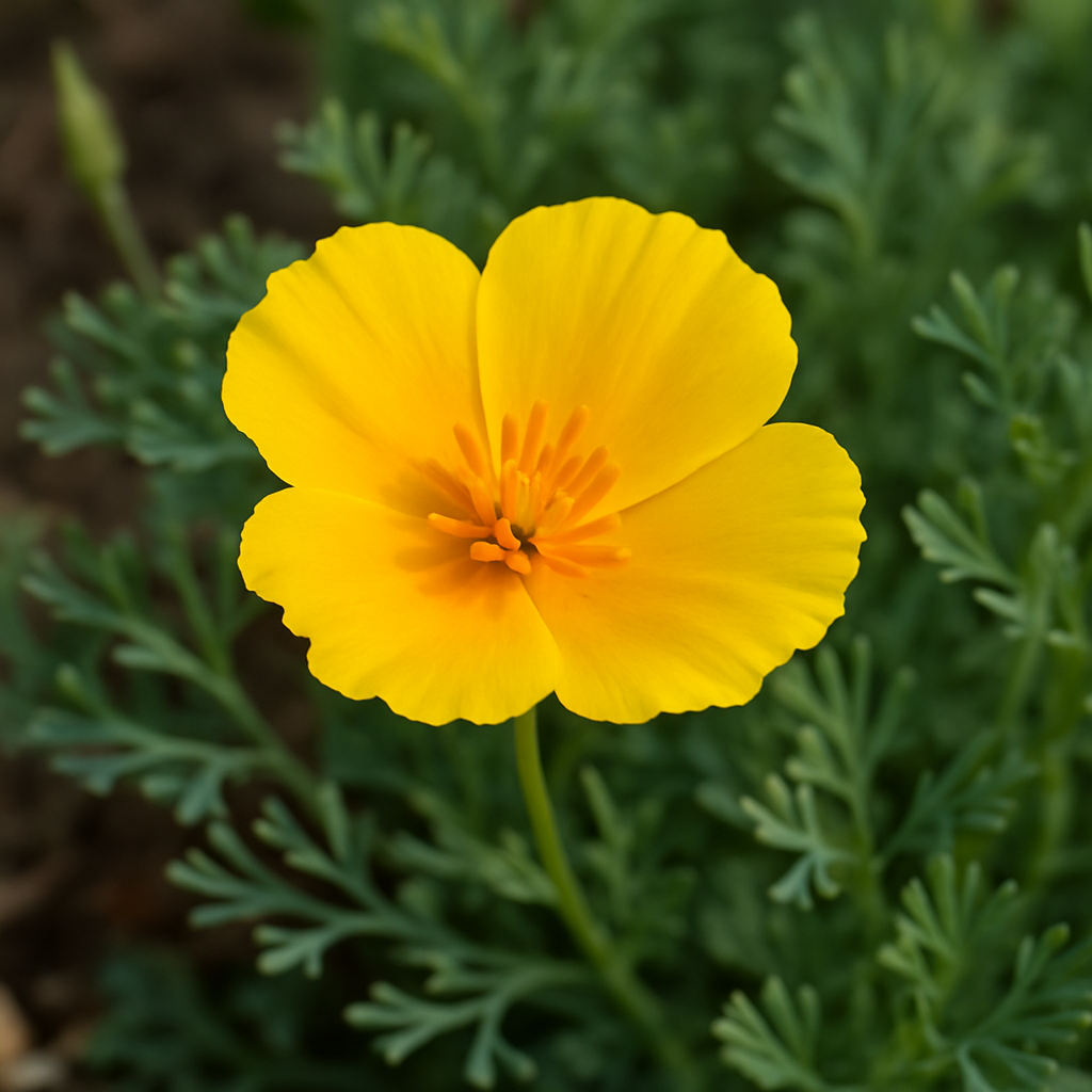 The Dwarf California Poppy forms low-growing tufts or clumps of foliage, reaching a height of about 4 to 8 inches (10 to 20 centimeters). The leaves are finely divided and bluish-green in color. The flowers are typically bright yellow or occasionally orange and have four petals with a rounded shape.