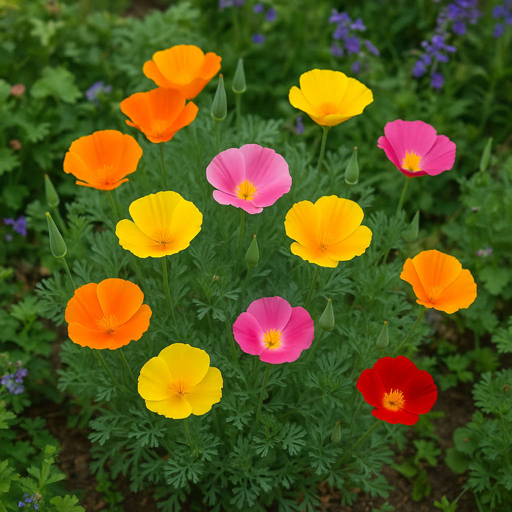 'Formula Mix' California Poppy typically grows to a height of 12 to 18 inches (30 to 45 centimeters). It has fern-like, bluish-green foliage similar to the species, and the flowers come in a mix of colors. The flower colors can include shades of orange, yellow, red, cream, and pink. The individual flowers have four petals and a distinctive yellow or orange center.