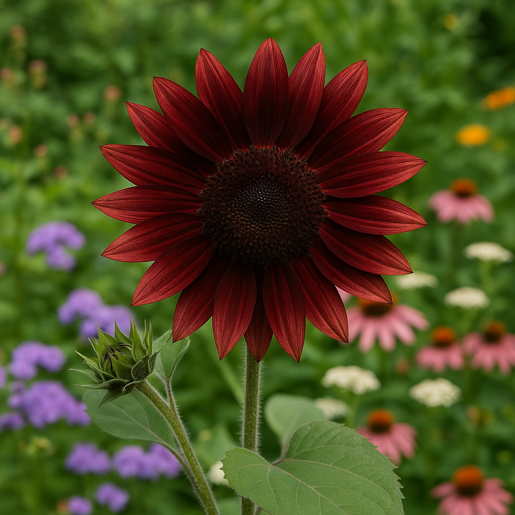 HELIANTHUS annuus 'Chocolate Cherry' (Sunflower - Chocolate Cherry) is a unique and eye-catching variety of the common sunflower. It is prized for its deep burgundy, almost chocolate-colored flower heads.