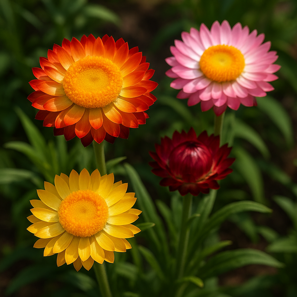 Dwarf Mixed Strawflower (Helichrysum bracteatum 'Dwarf Mixed') is a charming plant known for its compact size and long-lasting, colorful flowers that retain their vibrancy even when dried. Whether grown for fresh flower arrangements or for their ornamental value in dried flower crafts, Dwarf Mixed Strawflower can add a touch of unique beauty and texture to gardens, containers, and floral displays.