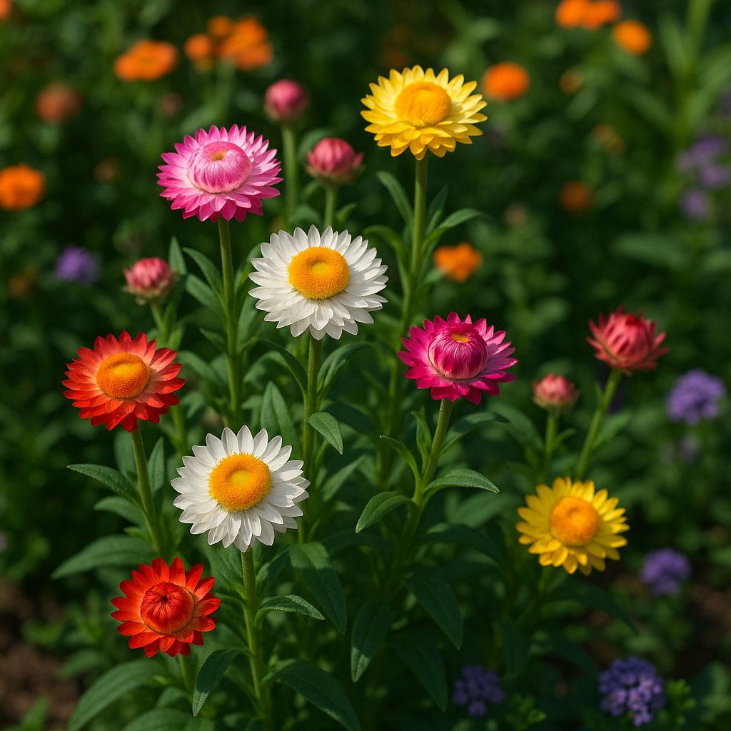 The flowers of Dwarf Mixed Strawflower are the main attraction. Each flower head is composed of tightly packed, papery bracts that form a colorful, daisy-like structure. The bracts come in a mix of vibrant colors, including shades of yellow, orange, red, pink, and purple. The true flowers are small and inconspicuous, nestled within the bracts. Strawflower blooms throughout the summer and early fall. While Strawflower is not known for being highly attractive to pollinators, the dried flower heads can provide shelter and nesting material for small insects and birds.