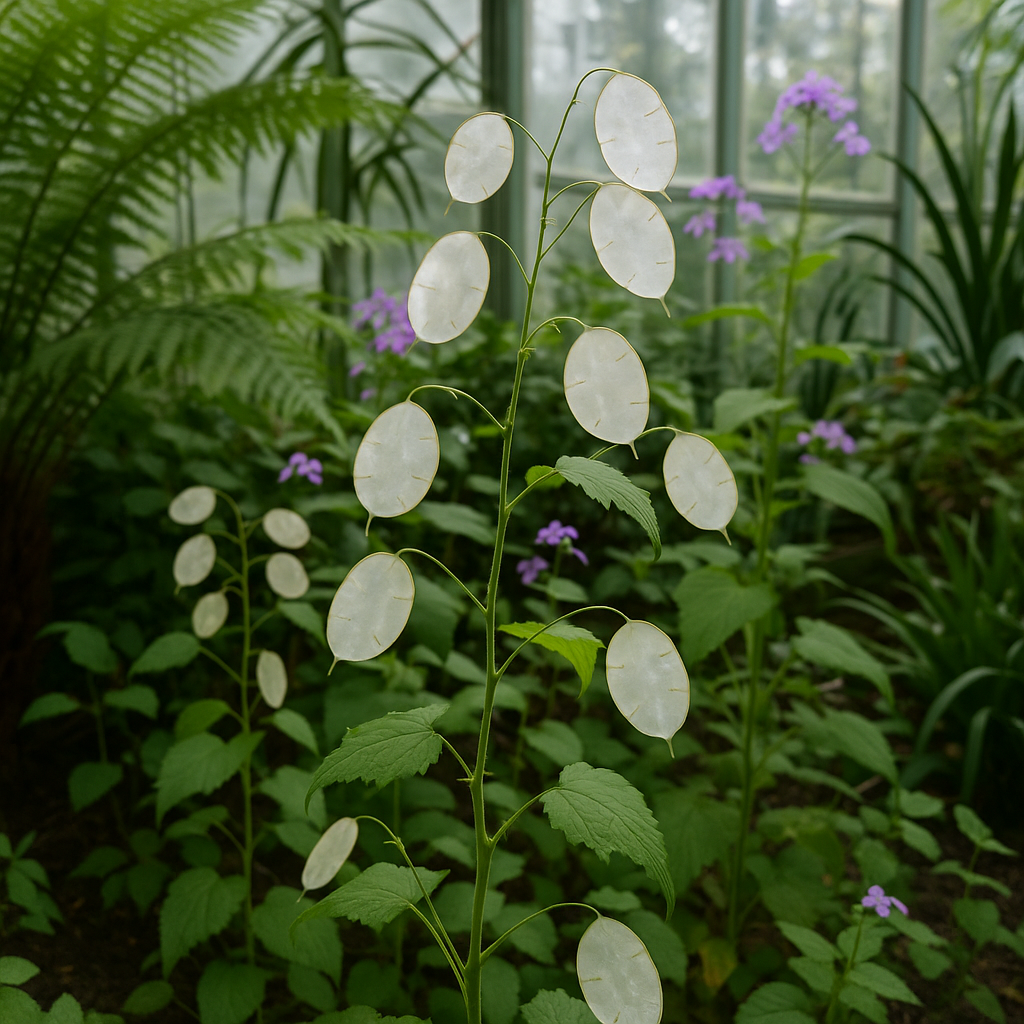 Money Plant grows as an upright, leafy plant with sturdy stems. In the first year, it primarily produces rosettes of large, heart-shaped leaves. In the second year, it sends up tall, erect stems with clusters of fragrant flowers. The flowers have four petals and are typically purple or lavender in color. After flowering, flat, round seed pods develop, which are silver-gray and papery, resembling coins or "money," hence the common name "Money Plant."