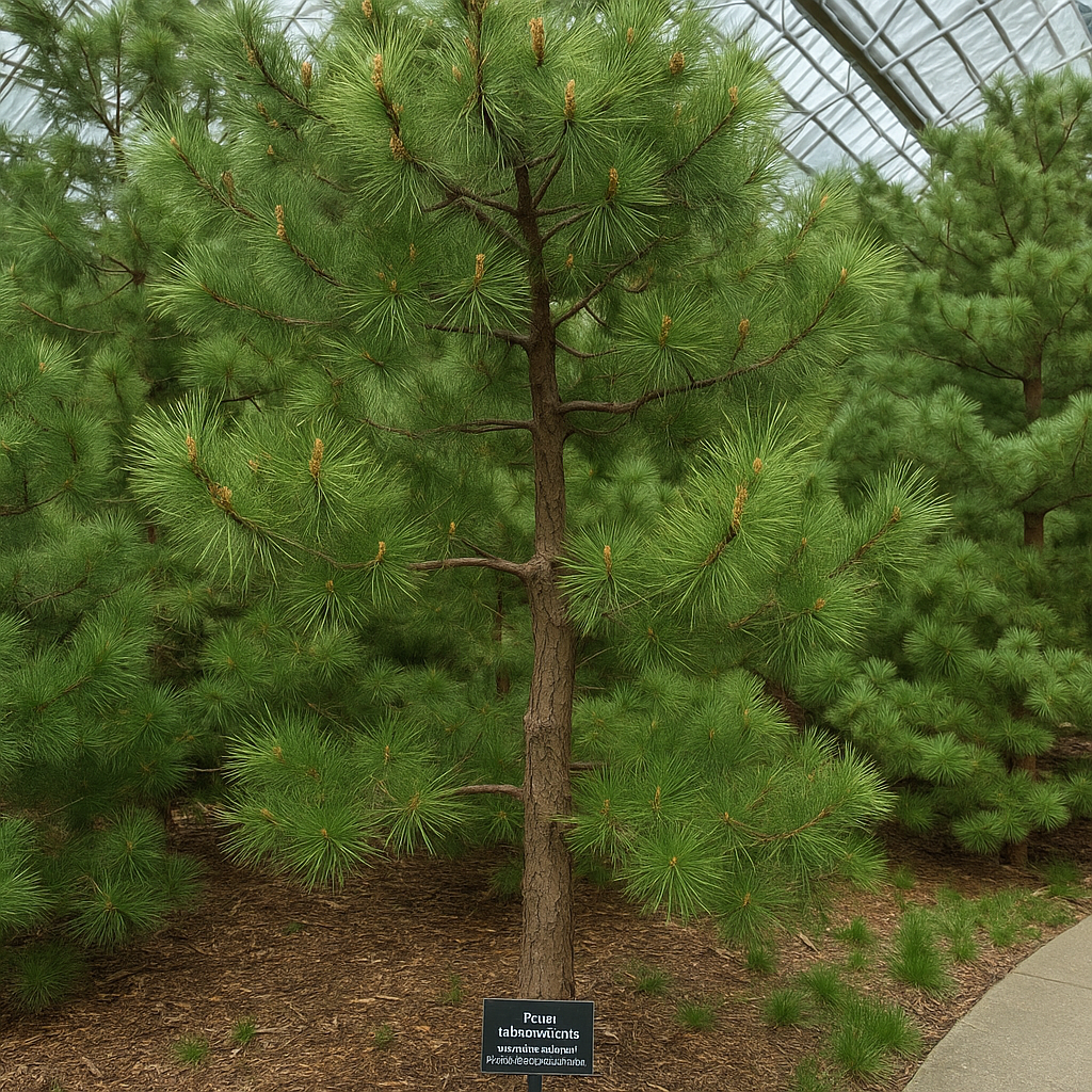 Chinese Table Pine typically reaches heights of 40 to 70 feet (12 to 21 meters) with a spread of 20 to 40 feet (6 to 12 meters). It has a broadly conical to rounded crown and a straight trunk covered in reddish-brown bark that becomes fissured with age.